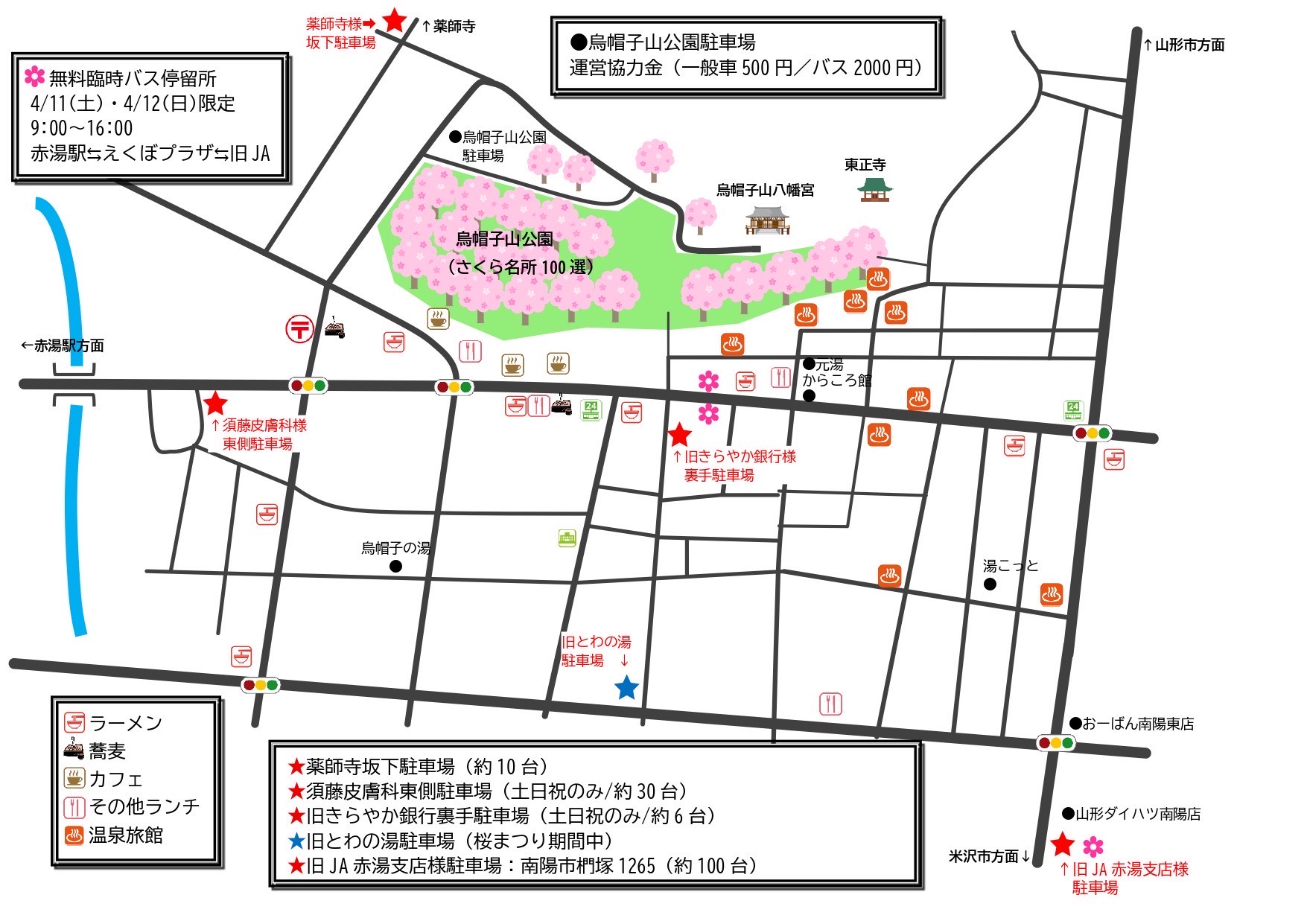 烏帽子山公園では、桜まつり期間中は会場駐車場や周辺道路が大変混雑いたします。混雑緩和と皆様の利便性向上のために、赤湯温泉街周辺に臨時駐車場をご用意いたします。臨時駐車場から会場に向かう温泉街の道すがらにも素敵なスポットがいっぱいですので、ぜひ街歩きも楽しんでいただきながら烏帽子山公園にお越しください。詳しくをチラシをご覧ください。