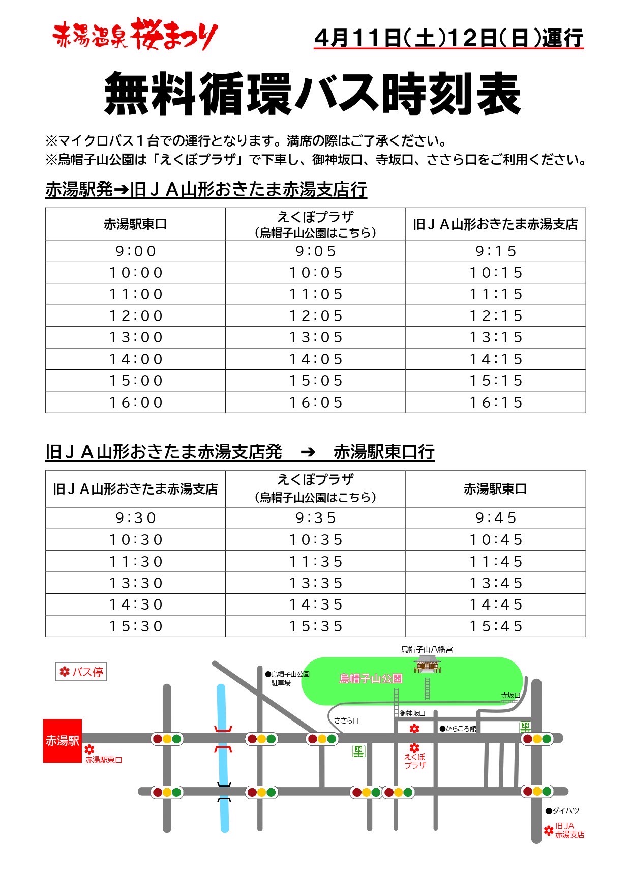 烏帽子山公園では、桜まつり期間中は会場駐車場や周辺道路が大変混雑いたします。混雑緩和と皆様の利便性向上のために、見頃が予測される11日(土)、12日(日)は無料の臨時バスを運行いたします。臨時バスは「赤湯駅⇔えくぼプラザ⇔旧JA赤湯支店」を往復運航いたします。詳しくをチラシをご覧ください。